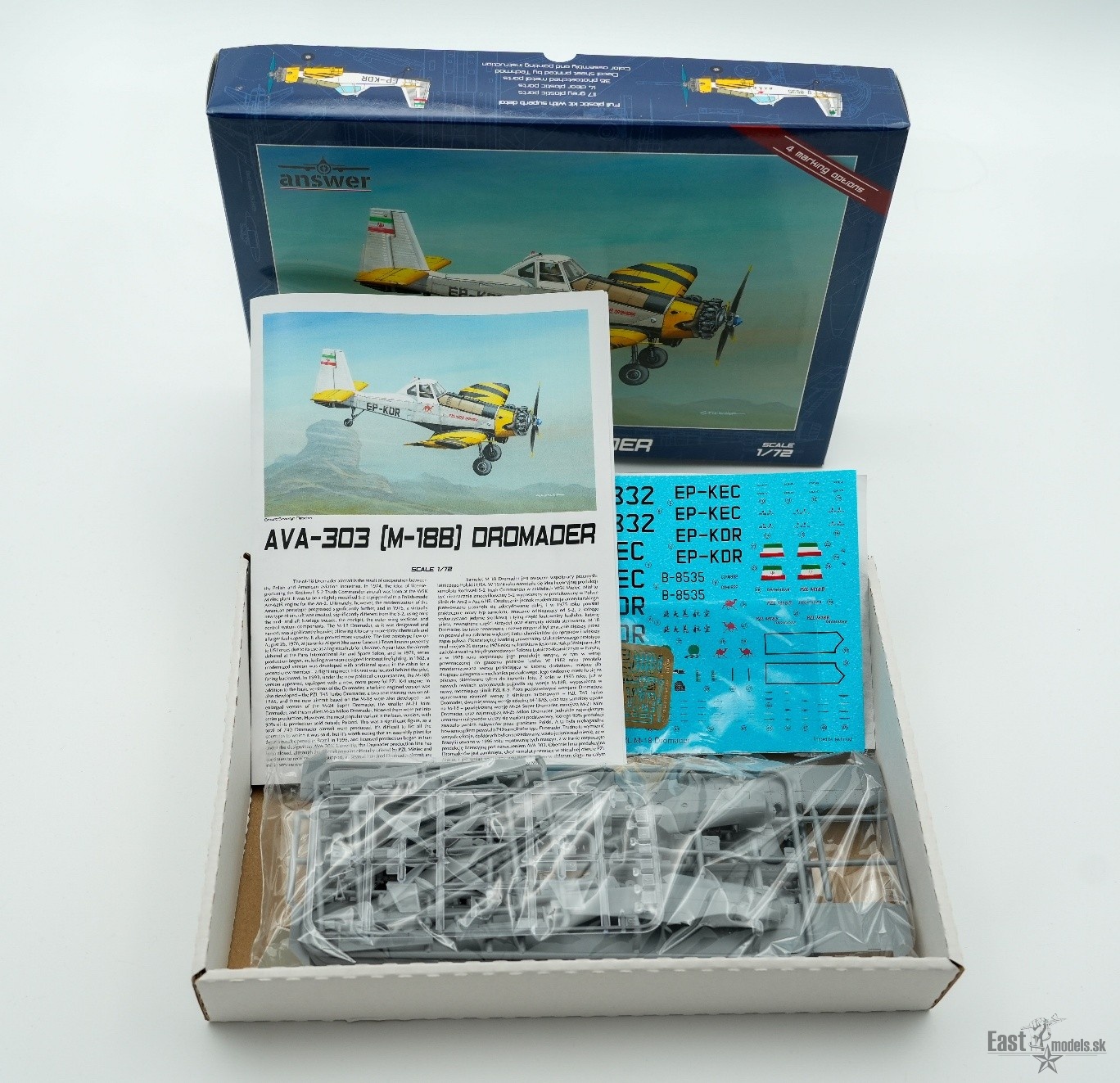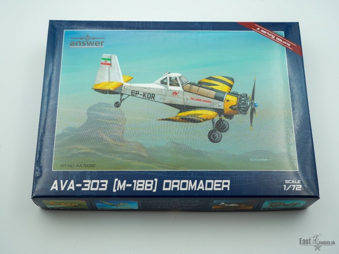 Poľská firma Answer sa špecializuje na menej tradičné námety lietadiel, často z poľského a východoeurópskeho prostredia. Ich stavebnice sú známe zaujímavými predlohami, dobrým rytím a bohatým obsahom v krabici. Model AVA-303 (M-18B) Dromader v mierke 1:72 predstavuje ikonické poľnohospodárske a hasičské lietadlo, ktoré je medzi modelármi veľmi obľúbené práve pre svoj netradičný vzhľad.