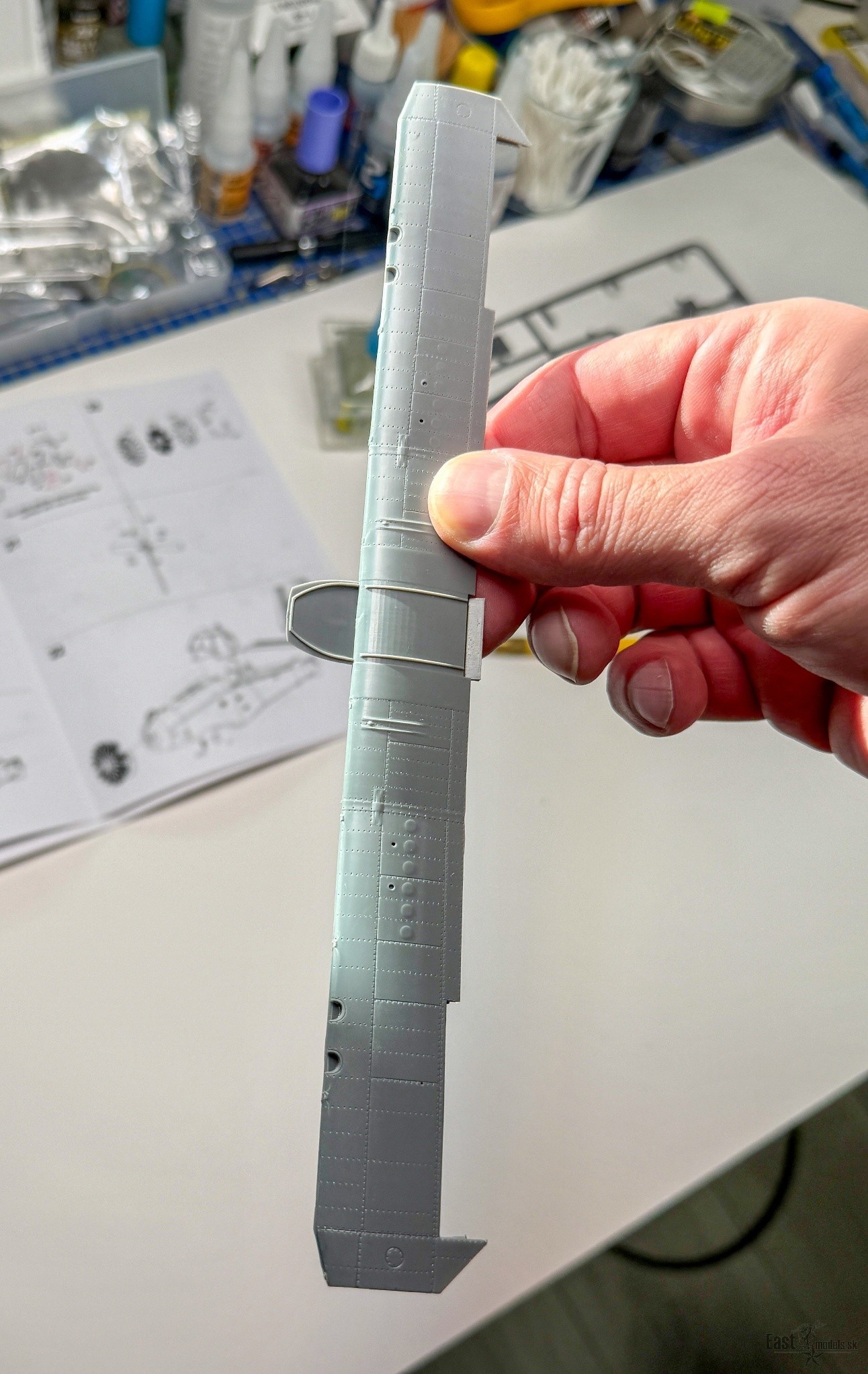 Samotná stavba modelu patrí k tým príjemnejším skúsenostiam. Nie je to nová Tamiya ani Eduard, ale po základnom začistení a na par dieloch aj od drobných otrepov k sebe jednotlivé časti zapadajú veľmi pekne a nie je potrebné neustále zasahovať tmelom či násilne upravovať spoje. Vďaka tomu postupuje práca rýchlo a bez zbytočných prestojov. Najviac ma potešil prechod medzi trupom a krídlom, ktorý je vyriešený takmer dokonale, aj keď na samotných krídlach, ktoré sú najväčšími dielmi stavebnice je celkom dosť práce na začisťovaní od rámiku. Spoj trup – krídlo teda pôsobí prirodzene a čisto, bez viditeľných medzier, takže nie je nutné strácať čas brúsením a obnovovaním rytia. Práve tento detail robí z modelu veľmi presvedčivý celok už v základnej stavbe.