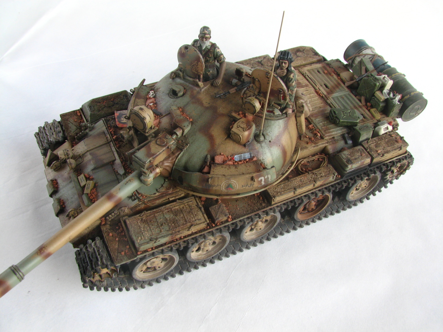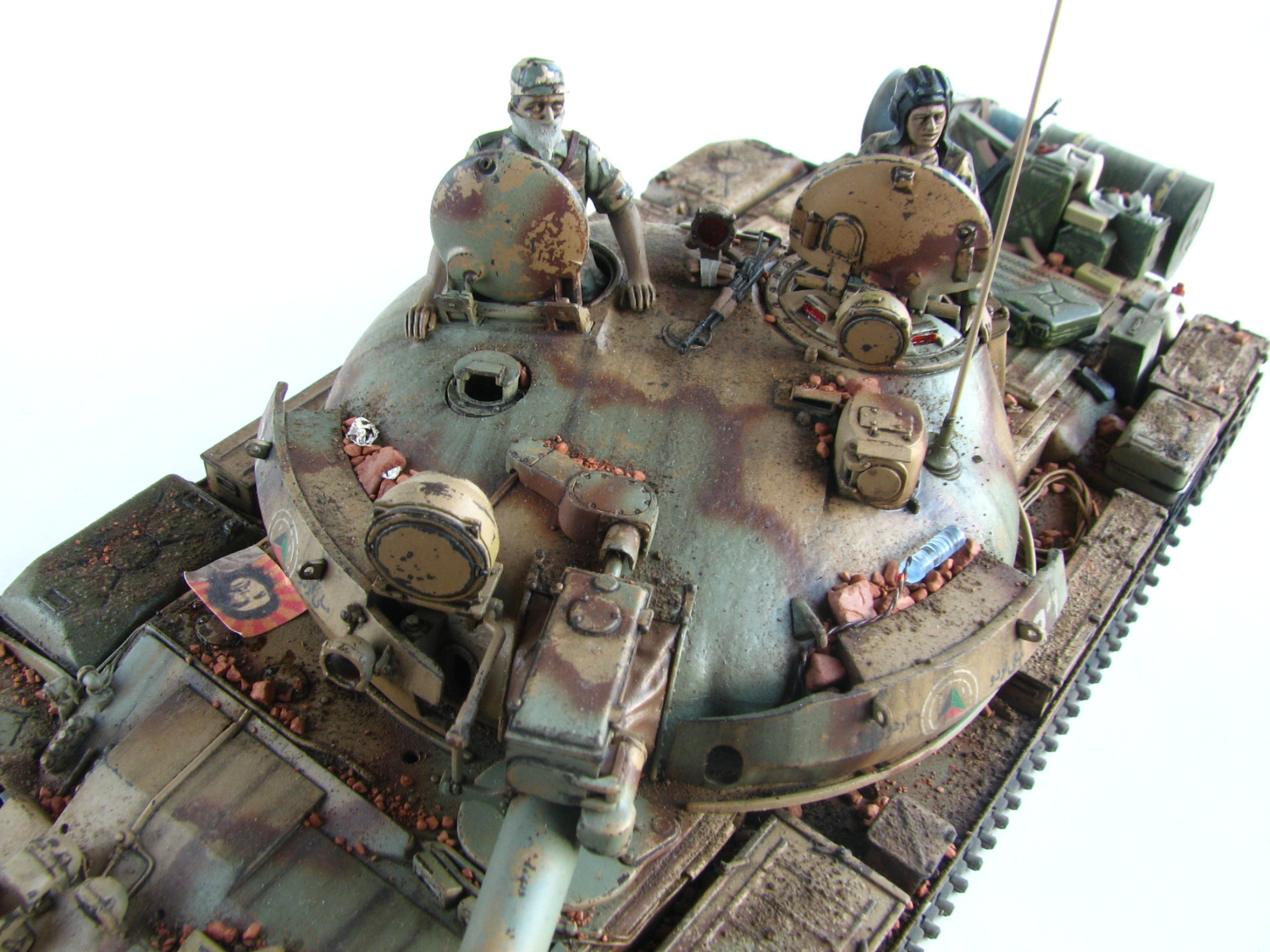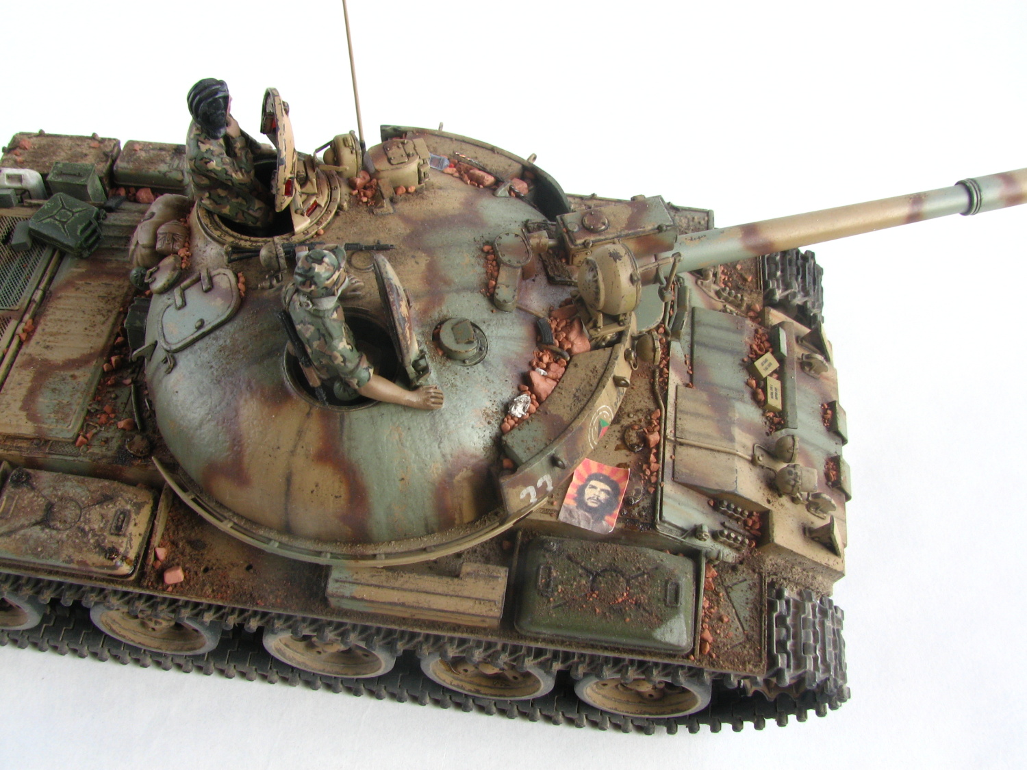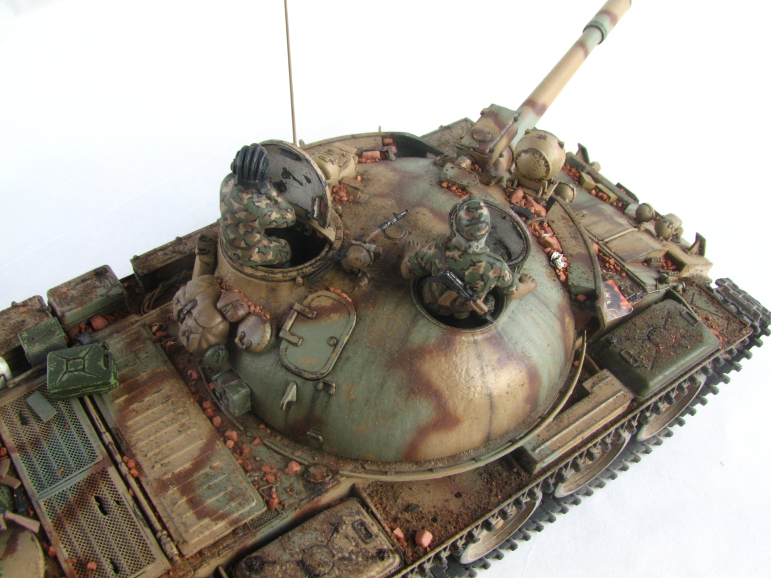 Samostatnou kategóriou bola výroba figúrok do poklopov. Pôvodne som myslel, že použijem tankistov priamo zo škatule, ale tí sú mimo mierku, a tak som si musel vyskladať vlastných. Vo veliteľskom poklope sedí figúrka ukradnutá z Tamiyáckej T-55A a parťáka mu robí kamarát stvorený z trupu juhokórejského tankistu, rúk a hlavy od Nemcov a so sovietskou čiapkou. Uniformy dali tiež celkom zabrať. Aby nesedeli len tak na sucho, pridal som k nim AK-74S a AK-74U, ktoré sa tiež nachádzali už v škatuli. Tankista naľavo dostal ako bonus šatku cez ústa. K napadaným kúskom tehiel pod prídavným pancierom som prihodil ešte zopár prázdnych zásobníkov, roxor, odpadky a fľašu vody.
