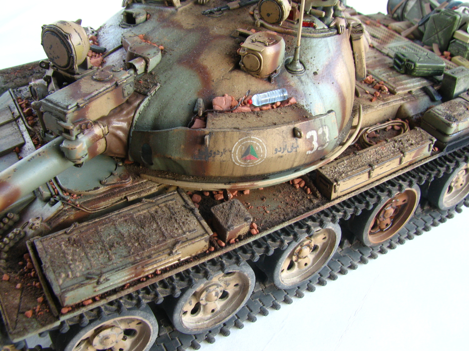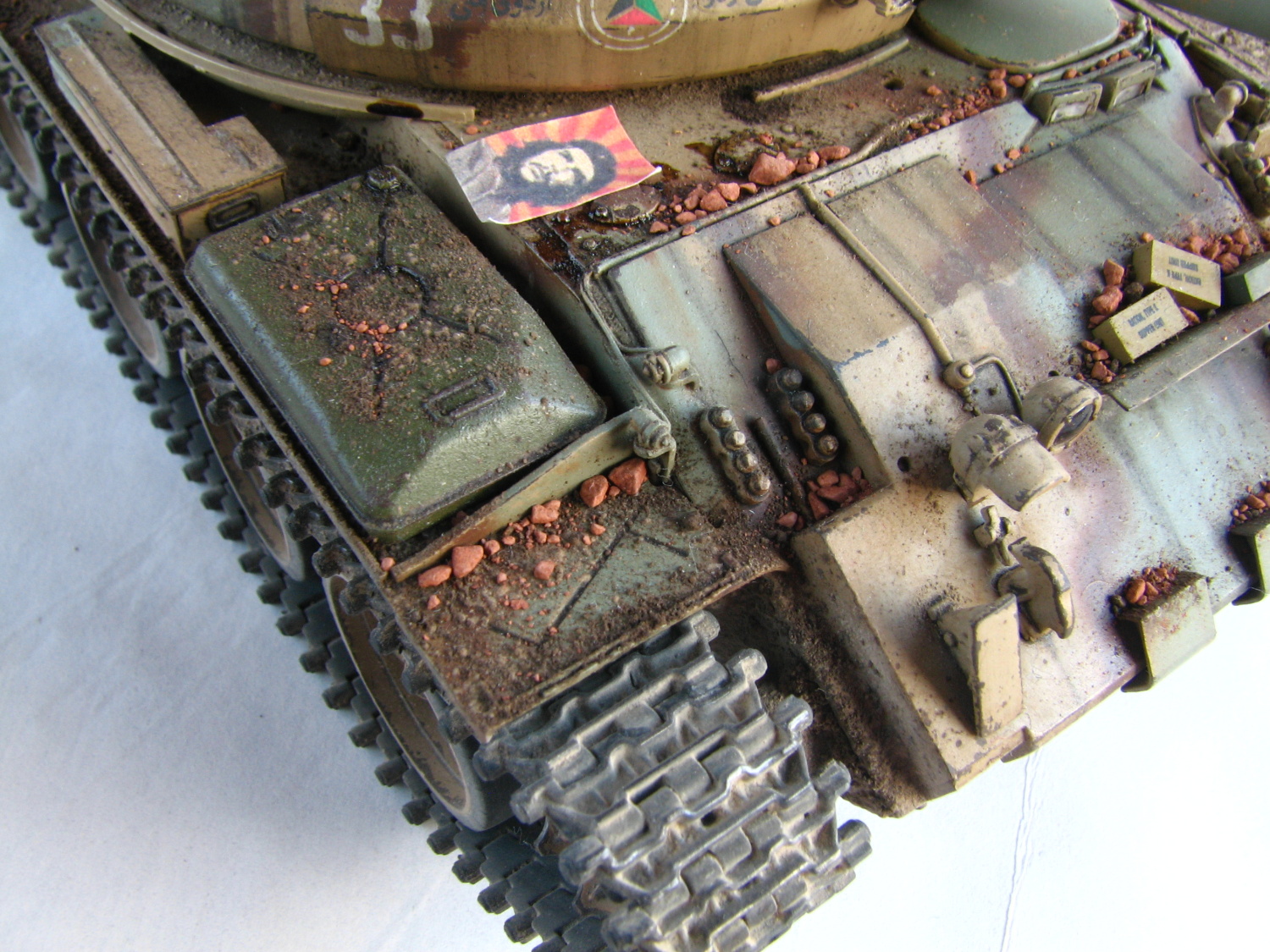 Na tanku je použitá celá škála rôznych drobností od rôznych výrobcov. Snažil som sa aby bol použitý materiál rozmiestnený rozumne, a aby celková kompozícia nepôsobila prehnane. Začal som sudmi na palivo. Zelený sud napravo je pôvodný zo stavebnice, ktorý ale bolo treba prebrúsiť a vytmeliť. Následne som použil ako základ červeno-hrdzavú farbu na ktorú prišla ruská zelená a mohlo sa odierať na podklad. Sud vedľa je pôvodom od Tamiye doplnený kontrastnými farbami bielej a modrej, ktoré takisto boli odreté na hrdzavý základ. Na uchytenie suda som použil nastrihané pásiky papiera. Výber doplnkov na korbu k sudom bol už len v úlohe fantázie.